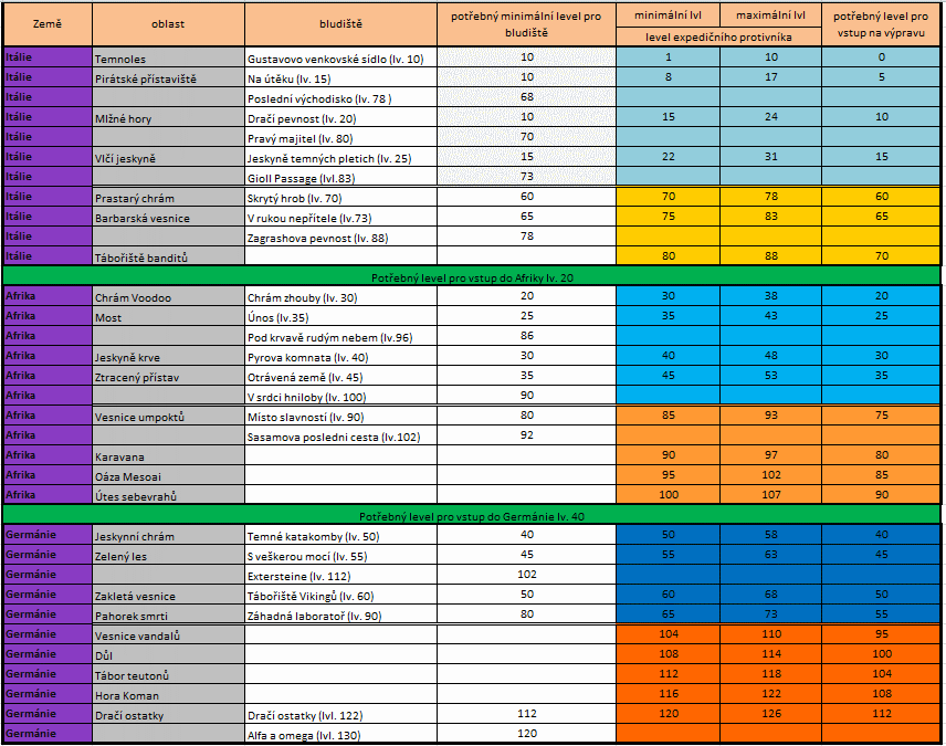 Zde je přehled všech dostupných výprav a bludišť a také potřebná úroveň k navštívení příslušné lokace.